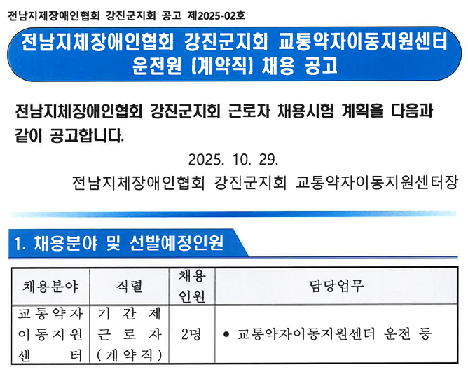 2025-2È£[¸ðÁý°ø°í 2025-2]Àü³²ÁöüÀå¾ÖÀÎÇùȸ °­Áø±ºÁöȸ ±³Åë¾àÀÚÀ̵¿Áö¿ø¼¾ÅÍ ¿îÀü¿ø Á÷¿ø ä¿ë °ø°í.pdf